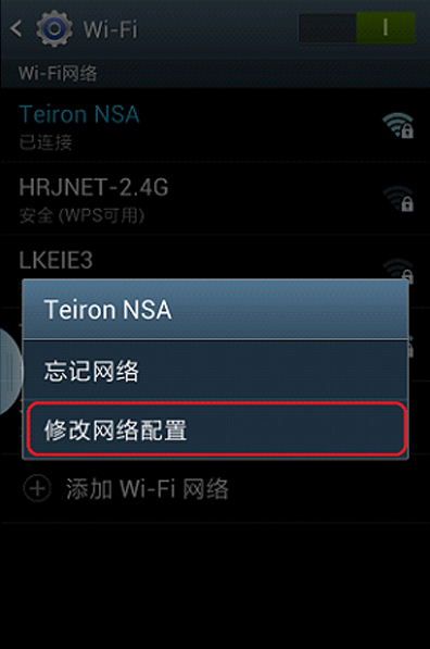在wifi列表中,选择已经连接的wifi名称,长按之后在弹出来的提示选择“修改网络配置”